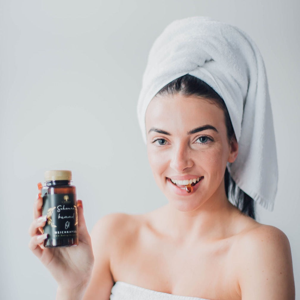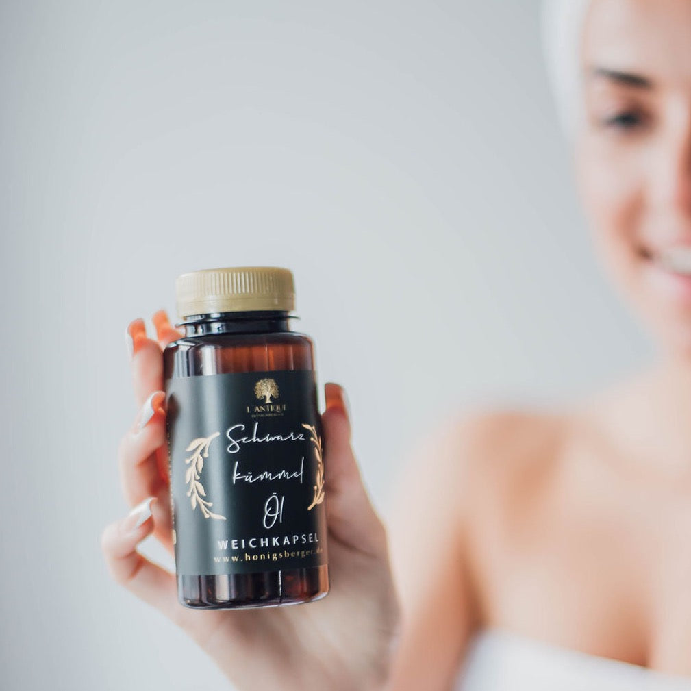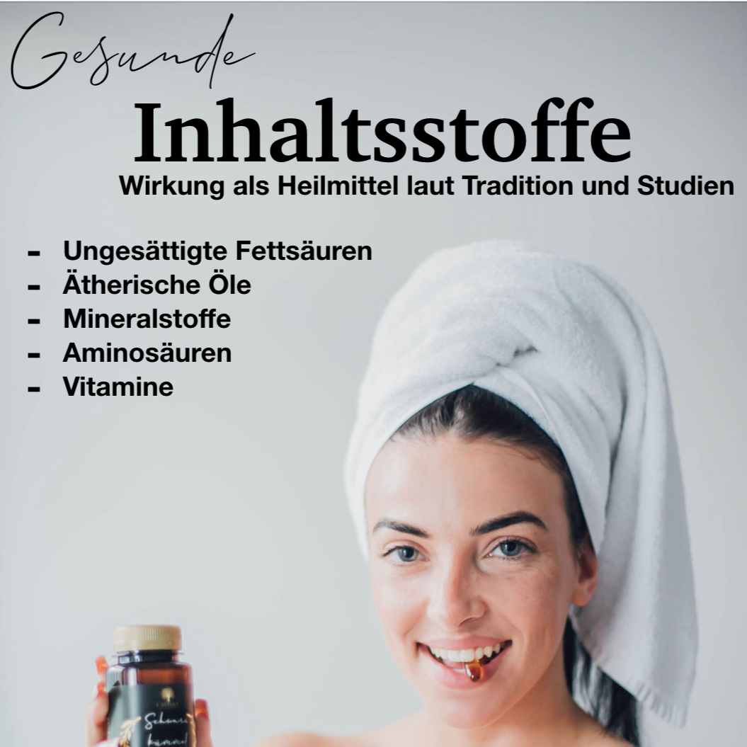 Genieße unsere wertvollen, HELAL-zertifizierten Schwarzkümmelöl-Weichkapseln.