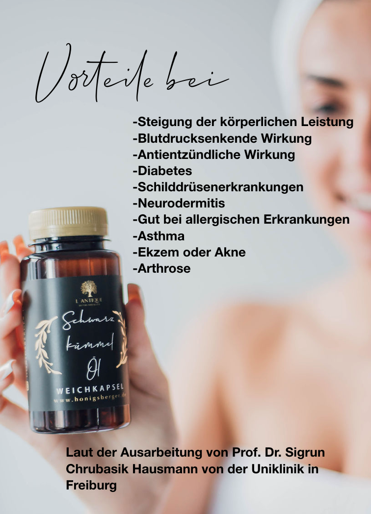 Schwarzkümmelöl stärkt das Immunsystem, reduziert Entzündungen und bekämpft Infektionen. Studien haben gezeigt, dass Schwarzkümmelöl positive Auswirkungen auf den Blutzuckerspiegel, Bluthochdruck und Asthma hat. Schwarzkümmelöl erzielt bei äußerlicher Anwendung effektive Ergebnisse auf Haut und Haar.